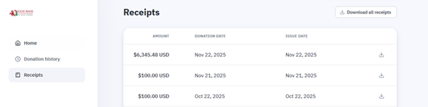 If you donate online, an email receipt is sent immediately after your donation is processed. If you do not see it, please check your spam, junk, or promotions folder. You can also view and download receipts in the Donor Portal under the “Receipts” tab.