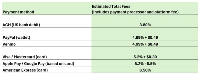 Paying by check or ACH typically incurs minimal bank fees. Payments through digital wallets (ApplePay, Google Pay) are assessed for fees based on the payment method connected to the digital wallet. Please see the chart below for estimated fees as of 12/2025.